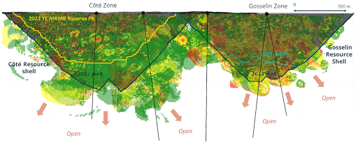 The Côté and Gosselin deposit type gold mineralization consists of low to moderate grade gold (±copper) mineralization associated with brecciated and altered tonalite and diorite rocks. Several styles of gold mineralization are recognized within the deposit, and include disseminated, breccia hosted and vein type, all of which are co-spatial with biotite (± chlorite), sericite and for the Côté deposit silica-sodic alteration.