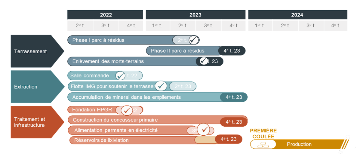 La production de Côté Gold devrait commencer au début de 2024. La construction du projet a commencé au troisième trimestre de 2020, et les travaux majeurs de préparation du site ont débuté au premier trimestre de 2021. Les étapes importantes réalisées récemment et les prochaines étapes importantes sont les suivantes :