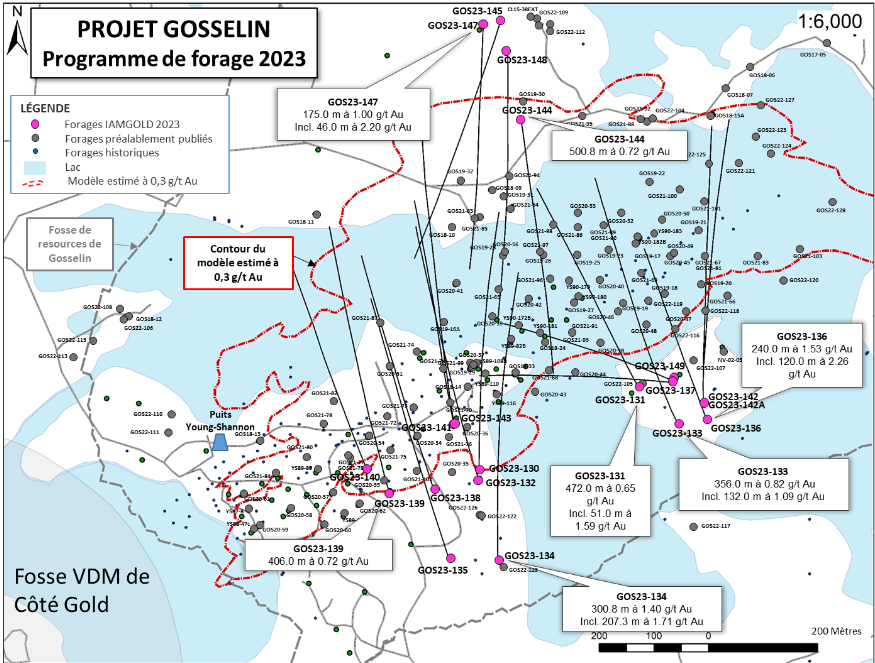 Au sujet du programme de forage à Gosselin, Craig MacDougall, premier vice-président, Croissance, d’IAMGOLD a indiqué : « Ce programme de forage au diamant ciblait stratégiquement le potentiel d’accroître l'étendue du gisement Gosselin en profondeur, plus précisément sous les corps bréchiques hydrothermaux à l’est et ceux récemment découverts à l’ouest, la zone intermédiaire entre ces corps bréchiques, ainsi que le long de l’extrémité sud du gisement. Les résultats d’analyse ont confirmé le prolongement des corps bréchiques hydrothermaux aurifères altérés et minéralisés et de la tonalite intersectée dans de nombreux trous de forage pouvant atteindre jusqu’à 400 mètres verticalement sous l’enveloppe de la fosse précédente sur une longueur latérale d’environ un kilomètre. Les résultats sont très encourageants et indiquent que l’étendue du gisement Gosselin, sous réserve de la réalisation d’autres forages de délimitation, pourrait être similaire à celle du gisement adjacent Côté Gold. »