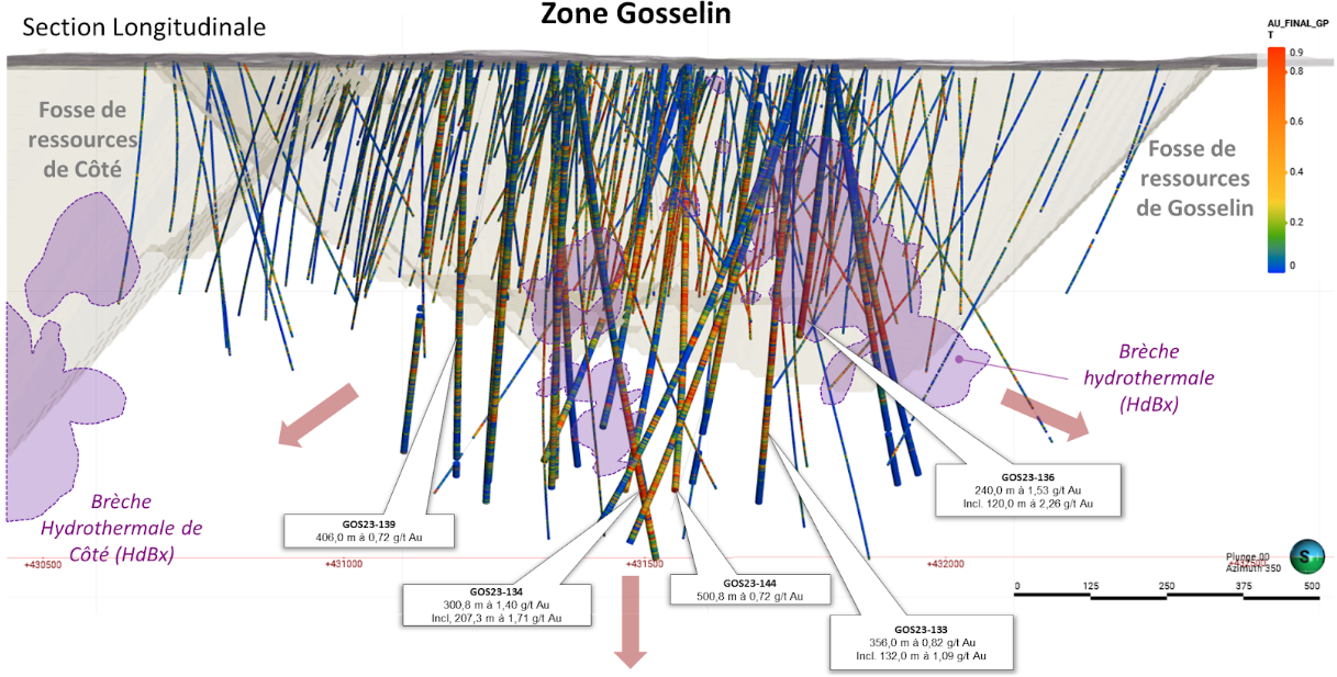 Les résultats favorables obtenus à ce stade du forage semblent indiquer que la taille du gisement Gosselin pourrait avoisiner celle du gisement Côté Gold adjacent. Les intersections de forage de la brèche ouest récemment découverte ont considérablement augmenté la taille du corps bréchique, de 250 mètres sur 170 mètres et d'une profondeur d’environ 400 mètres. Elles ont permis de mettre en relief un corridor hautement prometteur en profondeur et d’une longueur latérale pouvant atteindre 850 mètres, qui devra faire de tests, entre la brèche ouest de Gosselin et le corps bréchique hydrothermal du gisement Côté Gold. Cela représente une occasion d’exploration prioritaire en vue de prolonger davantage la ressource de Gosselin au-delà de la profondeur verticale de 400 mètres du tracé de la fosse actuelle établie en 2021.