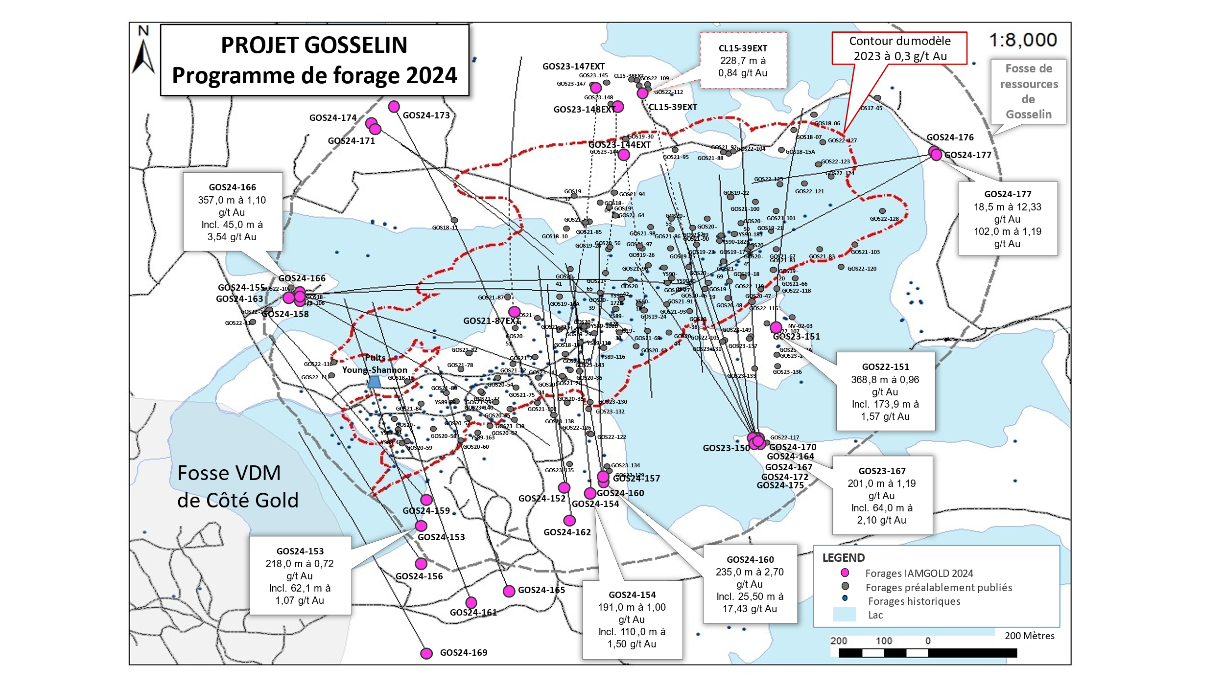 IAMGOLD présente de nouveaux résultats d’analyse obtenus de son nouveau programme de délimitation et de forage d’expansion à Gosselin. Le programme de forage au diamant en cours de 35 000 m cherche à cibler les prolongements potentiels de brèches minéralisées entre les zones Côté Gold et Gosselin et à tester la continuité de l’enveloppe minéralisée en profondeur dans la zone Gosselin. Les résultats des analyses publiés aujourd’hui comprennent trente-quatre (34) trous de forage au diamant totalisant 31 861 m réalisés entre le 19 août 2023 et le 3 septembre 2024. Ce programme comprend vingt-huit (28) trous de forage de taille NQ totalisant 29 603 m, ainsi que le prolongement de six (6) trous précédemment forés représentant 2 258 m. Les résultats d’analyse se trouvent au tableau 1 à la fin du présent communiqué.