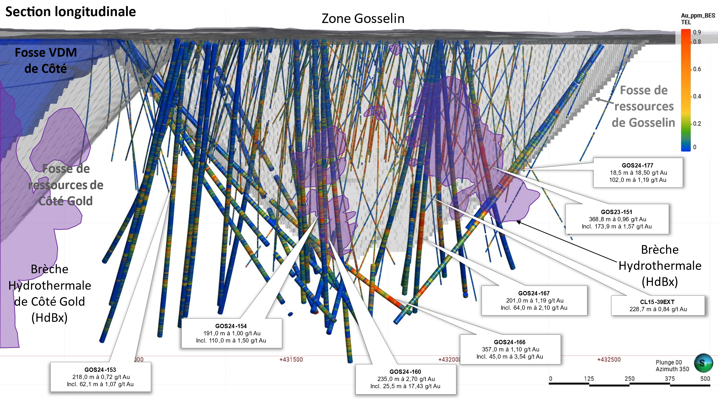 - La campagne de forage au diamant a permis de délimiter les prolongements de la ressource de la zone Gosselin à l’extérieur de l’enveloppe de la fosse définie au 31 décembre 2023. D'importants prolongements ont été recoupés au sud et à l’ouest de la brèche ouest de Gosselin et en profondeur entre la brèche de Côté Gold et la brèche ouest de Gosselin.